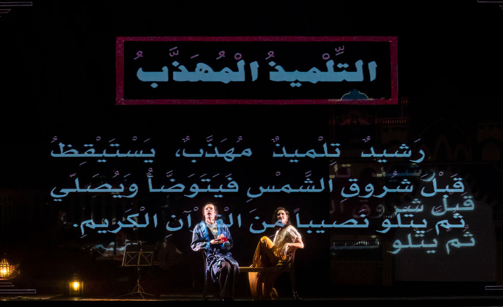 Sur le plateau/harem, les chanteurs donnent vie aux inoubliables héros des Mille et Une Nuits, portés par la musique de Poujade réorchestrée pour un ensemble instrumental occidental et oriental. Un syncrétisme audacieux qui réunit, en une forme lyrique innovante, la magie des contes orientaux, l’imaginaire de Jules Verne et le monde merveilleux de Méliès et des lanternes magiques…
